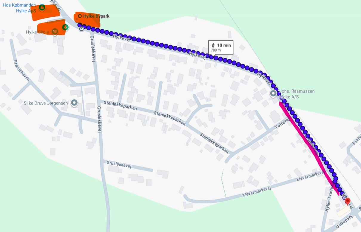 Det er muligt at parkere ved Hylke Bypark, Hylke Skole og Hylke købmand. Som set på billede, er det en gåtur på cirka 10 minutter